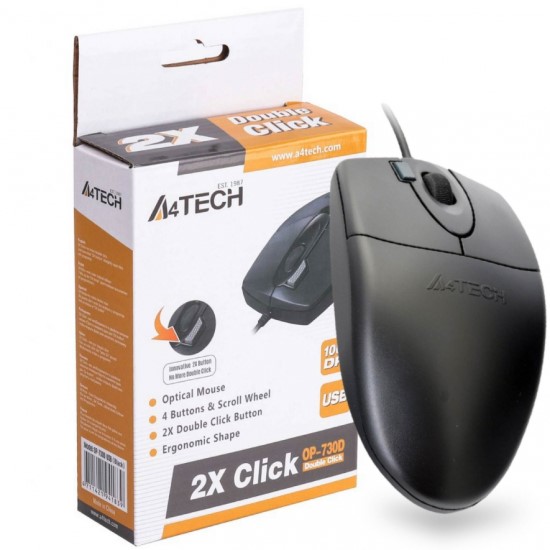 A4tech Wired Mouse OP-620D The A4tech optical wheel Mouse with hyper-fast scrolling for increased productivity. A nearly frictionless scroll wheel lets you fly through long documents and Web pages with a single flick. Experience smoother cursor control on virtually any surface. Contoured design give you more support and control. SPECIFICATIONS • Model?OP-620D / OP-620DS • Type: Wired • Ergonomic Design: Symmetric • Sensor: Optical • Resolution: 1000 DPI • Buttons No.: 4 • Port: USB • Cable Length: 150 cm • Net Weight:91 g (w/ cable) • System Requirements: Windows XP / Vista / 7 / 8 / 8.1 / 10
