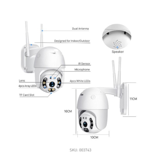 2 Way Audio, Fast notification, Motion Sensor, Night Vision, PTZ Technology, Remote viewer, Smart Full-Color Night Vision, Support Micro SD Card, Waterproof